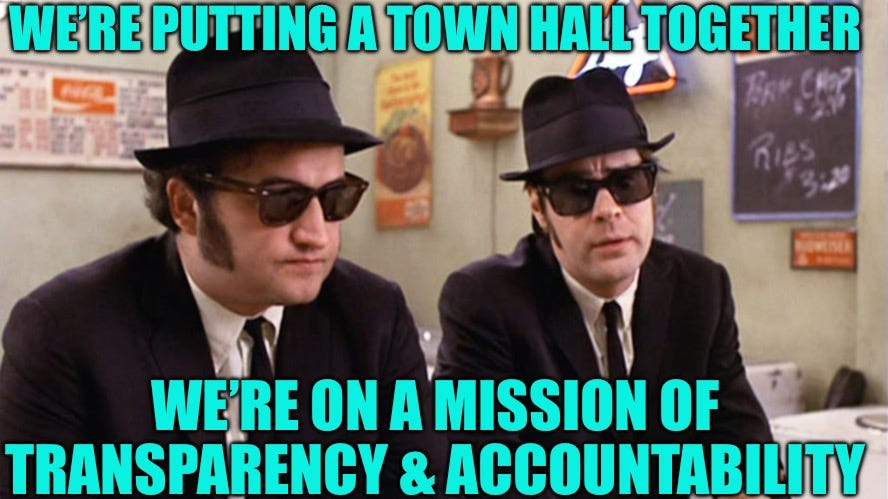 I am interested in making a town hall happen with others who want the same; it doesn’t take a formal committee, just people who want to make it happen getting together to brainstorm.